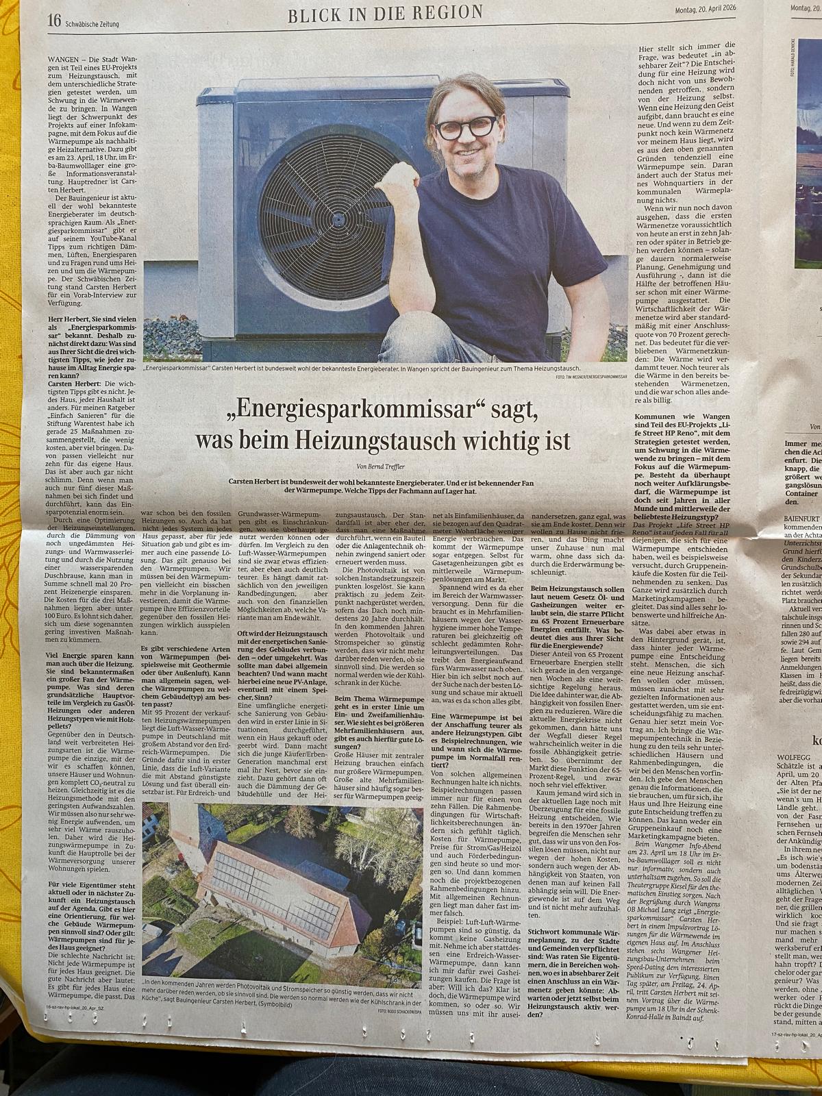 Die Stadt Wangen ist Partner eines EU-weiten Forschungsprojekts, das sich mit dem Thema Heizungstausch beschäftigt. Dabei steht der Einbau der Wärmepumpe im Mittelpunkt. Mit einer Informationsveranstaltung am 23. April 2026 will die Stadt die Bürgerinnen und Bürger für das Thema sensibilisieren und sie zum Tausch ihrer Heizung ermutigen. Auch das örtliche Handwerk wird wieder vertreten sein und Fragen rund um Heizungstausch und Wärmepumpe beantworten.